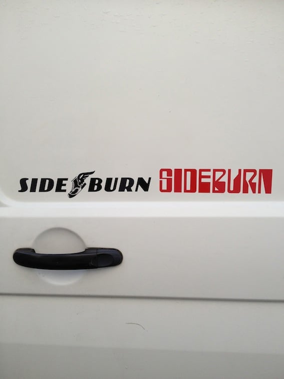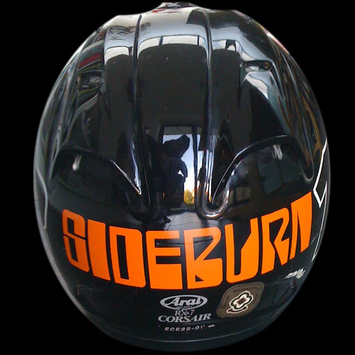 Design roughly 200mm (8in) in length. Sticker is shown on the back of a full-size Arai helmet.