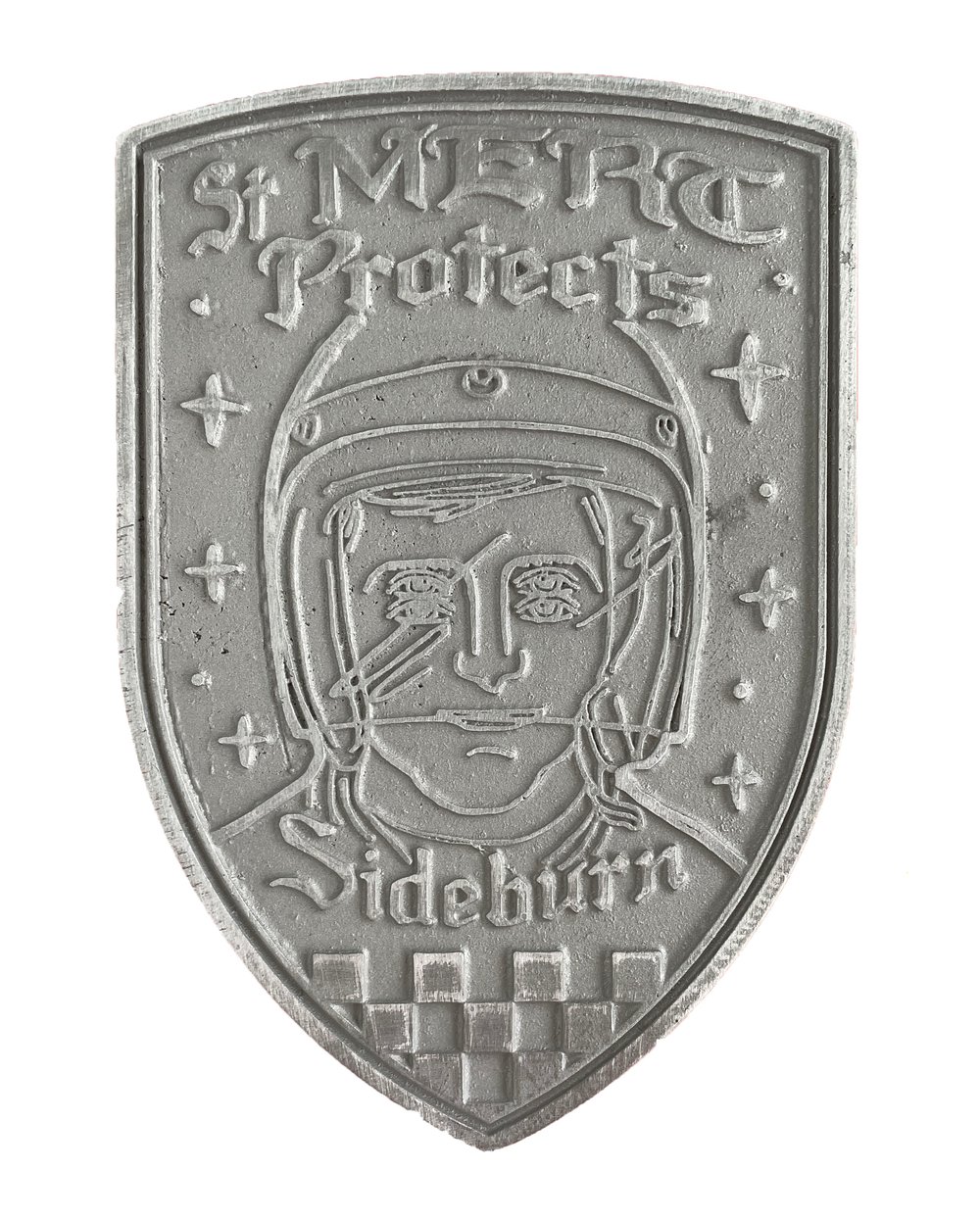 It's a sand cast aluminium shield that is guaranteed* to bring the owner good fortune. The original design was created for Sideburn by Toria Jaymes of Stay Outside Studio, and is based on a 14th century brass rubbing.